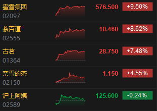 5月27日消息,港股茶饮股集体走强,截至发稿网络炒股配资,蜜雪集团股价涨超9%再创上市新高价,市值逼近2200亿港元;茶百道涨超8%;古茗涨超7%,亦再创上市新高,市值达689亿港元;奈雪的茶涨超4%。
